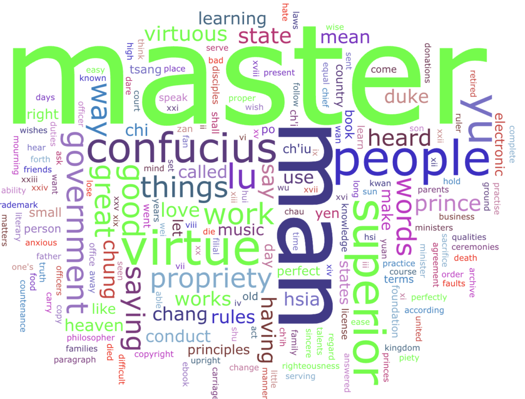 The word “master” is the most frequent and implies the analects impart wisdom from one person to another person or group of people. A master is what people refer to as a teacher or skilled person. We can surmise that Confucius was concerned with the virtue and propriety of people. The visualization connects to Digital Humanities by revealing the prominent points of the text versus a list of plain words and numbers.